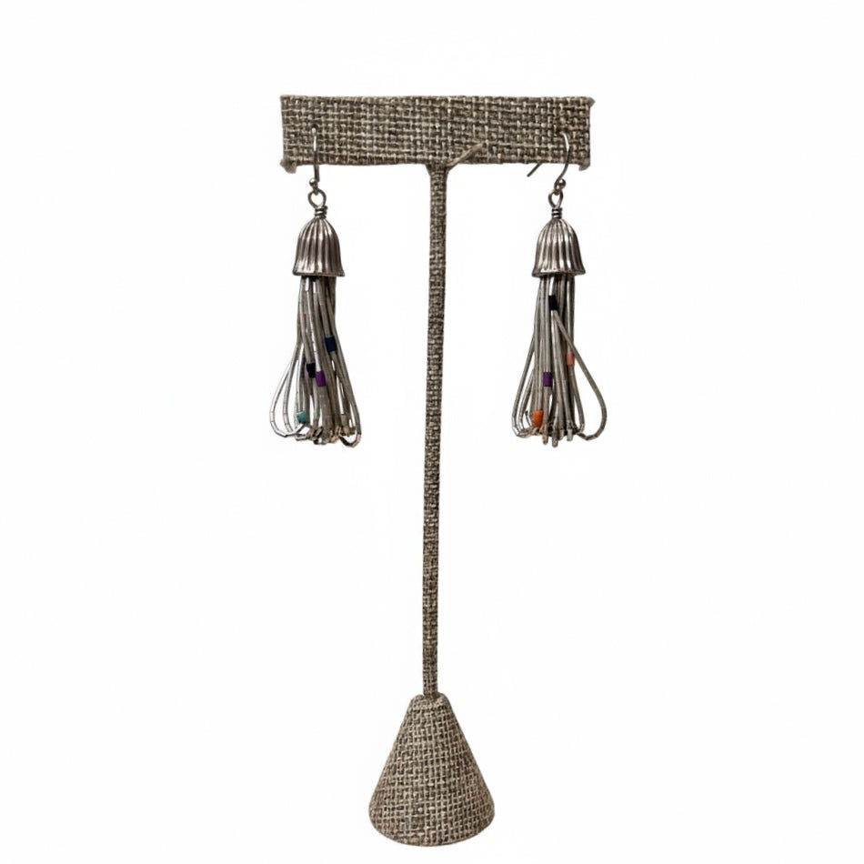 Modern and elegant, these handcrafted silver tassel earrings feature cascading strands accented with subtle inlays. The fluid movement and refined detailing create a graceful balance of artistry and sophistication.